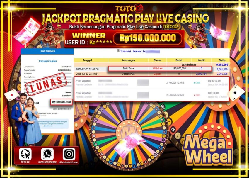Selamat kepada Member Kami Ke**** Telah Jackpot dan berhasil mendapatkan kemenangan besar pada permainan JACKPOT PRAGMATICK PLAY LIVE GAME CASINO (PP LIVE MEGA WHEEL) Dengan Kemenangan Sebesar Rp.190.000.000–. Setelah mengisi Fomulir Withdraw dengan Kurang waktu 1-2 Menit Dana sudah kami Trasnfer kepada Pemilik Userid dan dana sudah dapat di cairkan oleh pemenang. Bukti Pembayaran yang TOTO12 berikan merupakan Bukti Pembayaran yang SAH / VALID yang langsung Di dapatkan melalui transaksi dari Bank yang di Tunju.