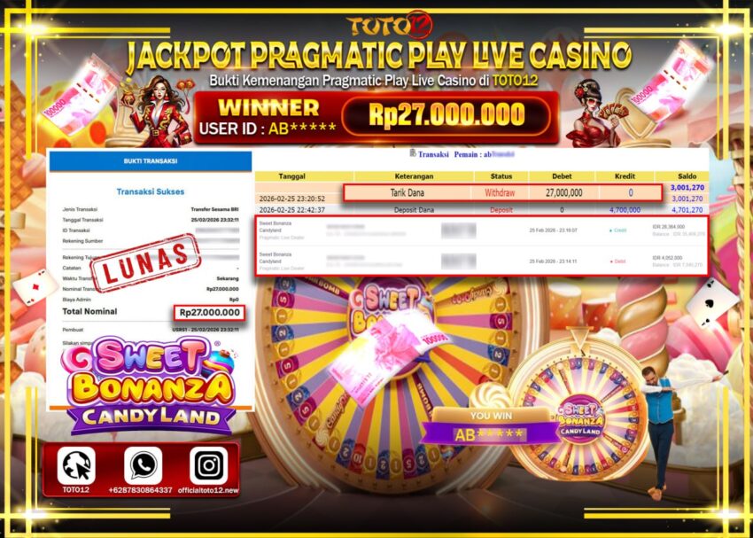 Selamat kepada Member Kami AB**** Telah Jackpot dan berhasil mendapatkan kemenangan besar pada permainan JACKPOT PRAGMATICK PLAY LIVE GAME CASINO (SWEET BONANZA) Dengan Kemenangan Sebesar Rp.27.000.000–. Setelah mengisi Fomulir Withdraw dengan Kurang waktu 1-2 Menit Dana sudah kami Trasnfer kepada Pemilik Userid dan dana sudah dapat di cairkan oleh pemenang. Bukti Pembayaran yang TOTO12 berikan merupakan Bukti Pembayaran yang SAH / VALID yang langsung Di dapatkan melalui transaksi dari Bank yang di Tunju.