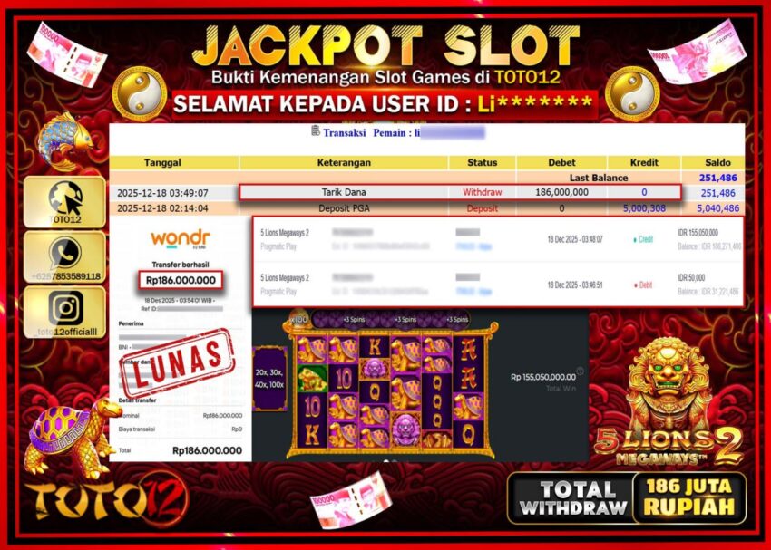 HANYA DI TOTO12 JP PASTI DI BAYAR LUNAS DAN CEPAT!!!!!! JACKPOT SLOT GAME (5 LIONS MEGAWAYS 2) Rp.186.000.000 !!!!