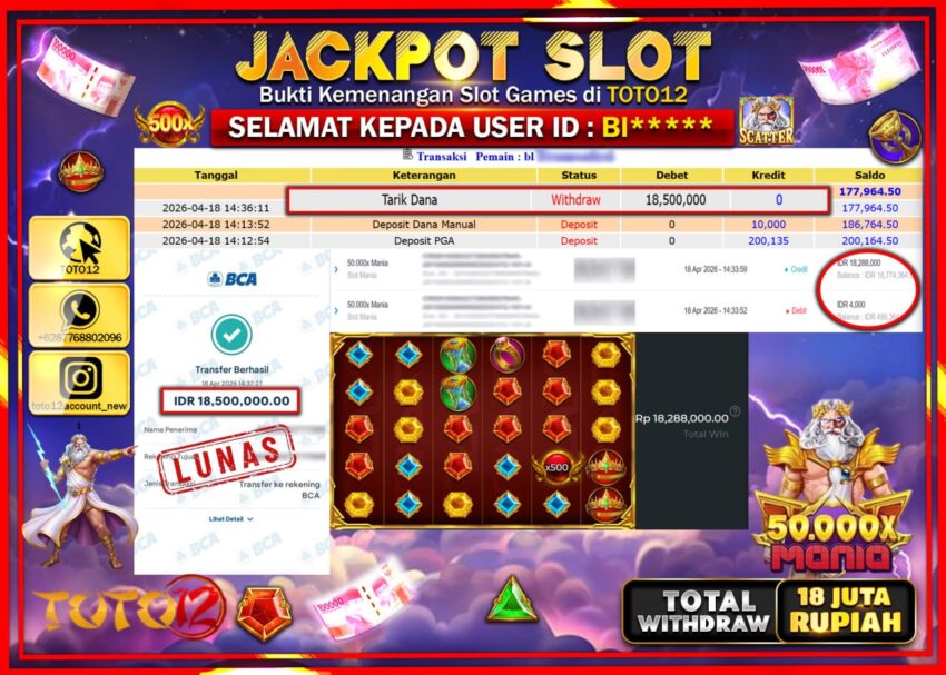 Selamat kepada Member Kami Bl***** Telah Jackpot dan berhasil mendapatkan kemenangan besar pada permainan JACKPOT SLOT GAME (50.000X MANIA) Dengan Kemenangan Sebesar Rp.18.500.000–.