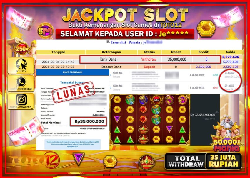 HANYA DI TOTO12 JP PASTI DI BAYAR LUNAS DAN CEPAT!!!!!! JACKPOT SLOT GAME (50.000X MANIA) Rp.35.000.000!!!!
