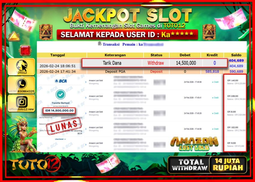 Selamat kepada Member Kami Ka***** Telah Jackpot dan berhasil mendapatkan kemenangan besar pada permainan JACKPOT SLOT GAME (AMAZON LOST GOLD) Dengan Kemenangan Sebesar Rp.14.500.000–.