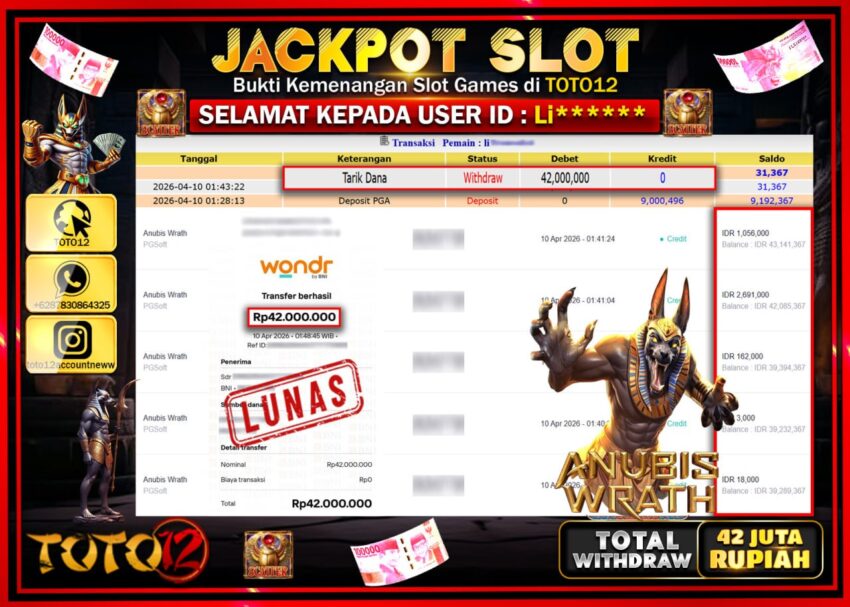 Selamat kepada Member Kami Li***** Telah Jackpot dan berhasil mendapatkan kemenangan besar pada permainan JACKPOT SLOT GAME (ANUBIS WARTH) Dengan Kemenangan Sebesar Rp.42.000.000–.