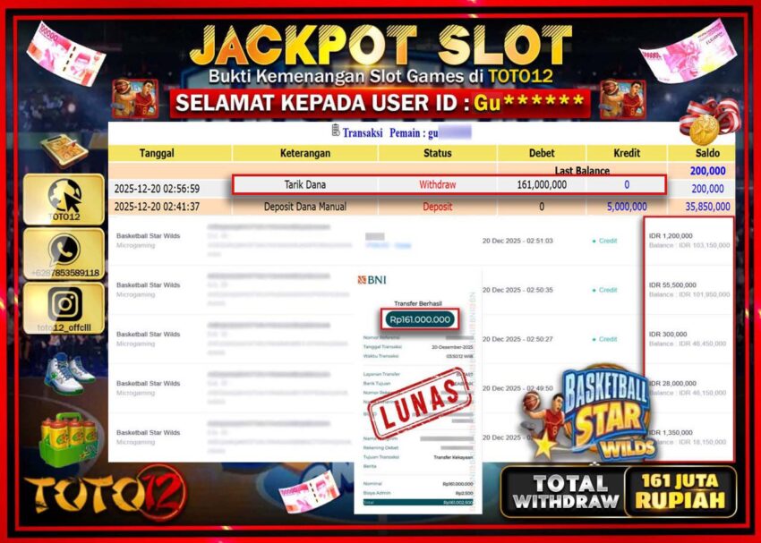 Selamat kepada Member Kami Gu****** Telah Jackpot dan berhasil mendapatkan kemenangan besar pada permainan JACKPOT SLOT GAME (BASKETBALL STAR WILDS) Dengan Kemenangan Sebesar Rp.161.000.000 –.
