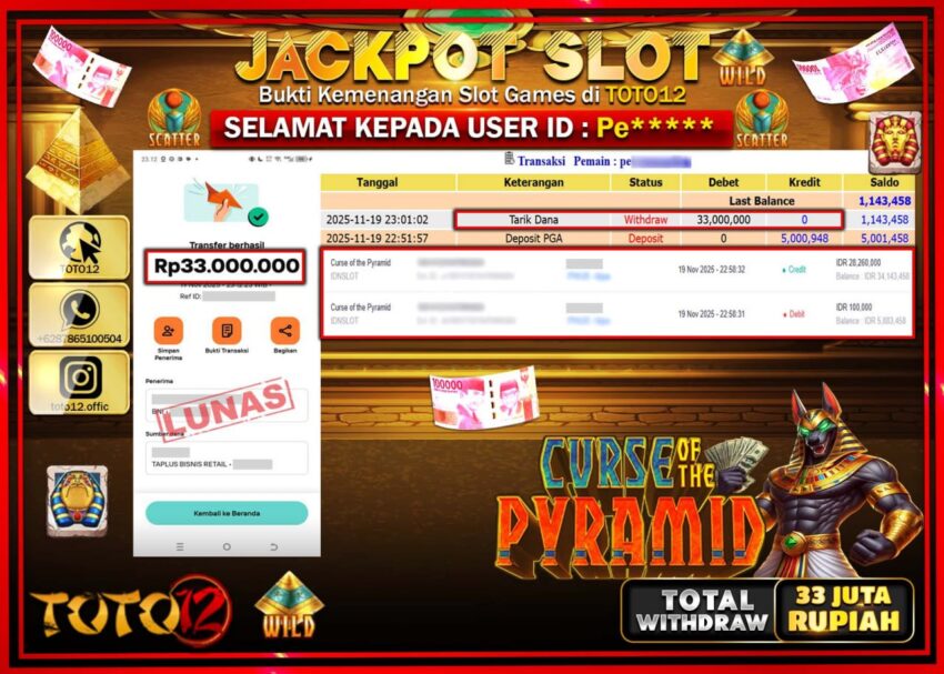 Selamat kepada Member Kami Pe****** Telah Jackpot dan berhasil mendapatkan kemenangan besar pada permainan JACKPOT SLOT GAME (CURSE OF THE PYRAMID)  Dengan Kemenangan Sebesar Rp.33.000.000 –.  Setelah mengisi Fomulir Withdraw dengan Kurang waktu 1-2 Menit Dana sudah kami Trasnfer kepada Pemilik Userid dan dana sudah dapat di cairkan oleh pemenang. Bukti Pembayaran yang TOTO12 berikan merupakan Bukti Pembayaran yang  SAH / VALID yang langsung Di dapatkan melalui transaksi dari Bank yang di Tunju.