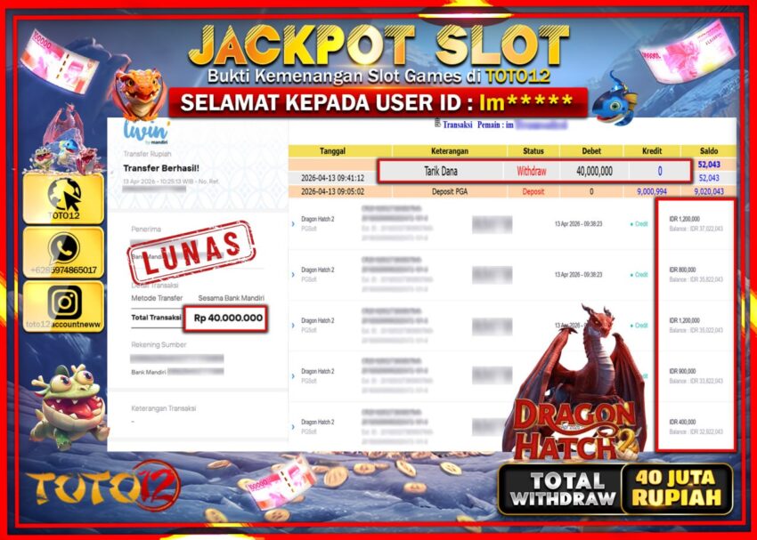 Selamat kepada Member Kami Im***** Telah Jackpot dan berhasil mendapatkan kemenangan besar pada permainan JACKPOT SLOT GAME  (DRAGON HATCH)  Dengan Kemenangan Sebesar Rp.40.000.000–.