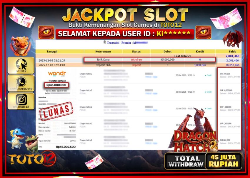 Selamat kepada Member Kami Ki****** Telah Jackpot dan berhasil mendapatkan kemenangan besar pada permainan JACKPOT SLOT GAME (DRAGON HATCH) Dengan Kemenangan Sebesar Rp.45.000.000 –.