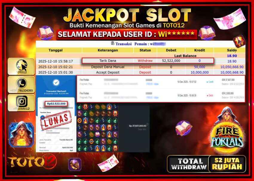 Selamat kepada Member Kami Wi****** Telah Jackpot dan berhasil mendapatkan kemenangan besar pada permainan JACKPOT SLOT GAME (FIRE PORTALS) Dengan Kemenangan Sebesar Rp.52.522.000 –.