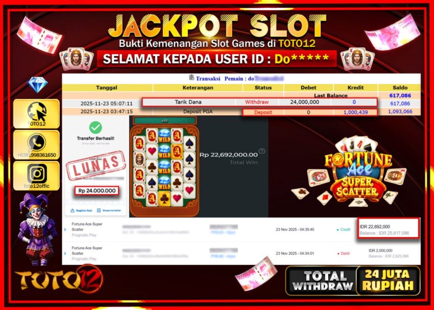 Selamat kepada Member Kami Do****** Telah Jackpot dan berhasil mendapatkan kemenangan besar pada permainan JACKPOT SLOT GAME (FORTUNE ACE SUPER SCATTER) Dengan Kemenangan Sebesar Rp.24.000.000 –. Setelah mengisi Fomulir Withdraw dengan Kurang waktu 1-2 Menit Dana sudah kami Trasnfer kepada Pemilik Userid dan dana sudah dapat di cairkan oleh pemenang. Bukti Pembayaran yang TOTO12 berikan merupakan Bukti Pembayaran yang SAH / VALID yang langsung Di dapatkan melalui transaksi dari Bank yang di Tunju.