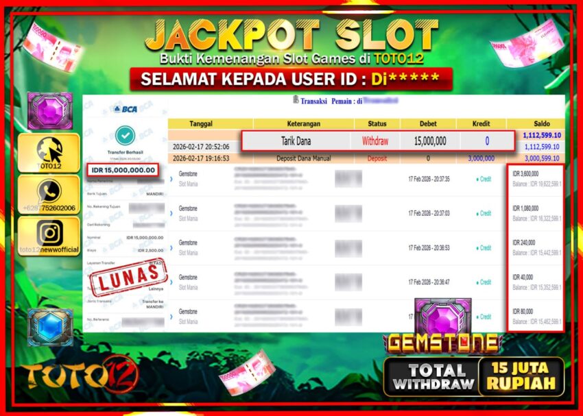 Selamat kepada Member Kami Di******* Telah Jackpot dan berhasil mendapatkan kemenangan besar pada permainan JACKPOT SLOT GAME (GAME STONE) Dengan Kemenangan Sebesar Rp.15.000.000–.