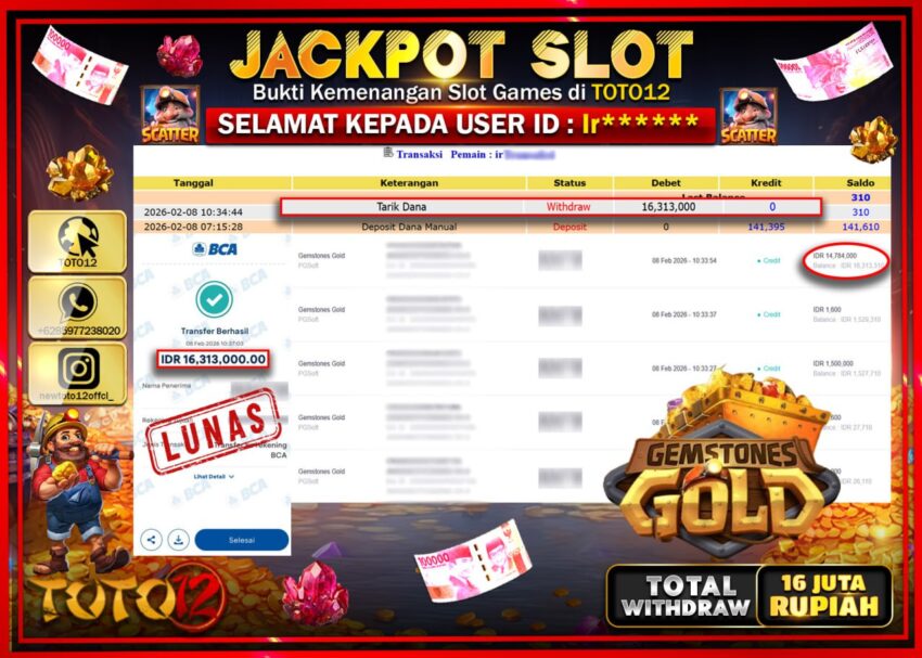 Selamat kepada Member Kami Ir**** Telah Jackpot dan berhasil mendapatkan kemenangan besar pada permainan JACKPOT SLOT GAME (GAMESTONES GOLD) Dengan Kemenangan Sebesar Rp.16.313.000–.