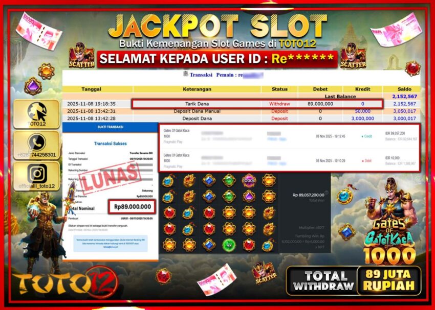 Selamat kepada Member Kami Re****** Telah Jackpot dan berhasil mendapatkan kemenangan besar pada permainan JACKPOT SLOT GAME (GATES OF GATOT KACA 1000) Dengan Kemenangan Sebesar Rp.89.000.000 –. Setelah mengisi Fomulir Withdraw dengan Kurang waktu 1-2 Menit Dana sudah kami Trasnfer kepada Pemilik Userid dan dana sudah dapat di cairkan oleh pemenang. Bukti Pembayaran yang TOTO12 berikan merupakan Bukti Pembayaran yang SAH / VALID yang langsung Di dapatkan melalui transaksi dari Bank yang di Tunju.