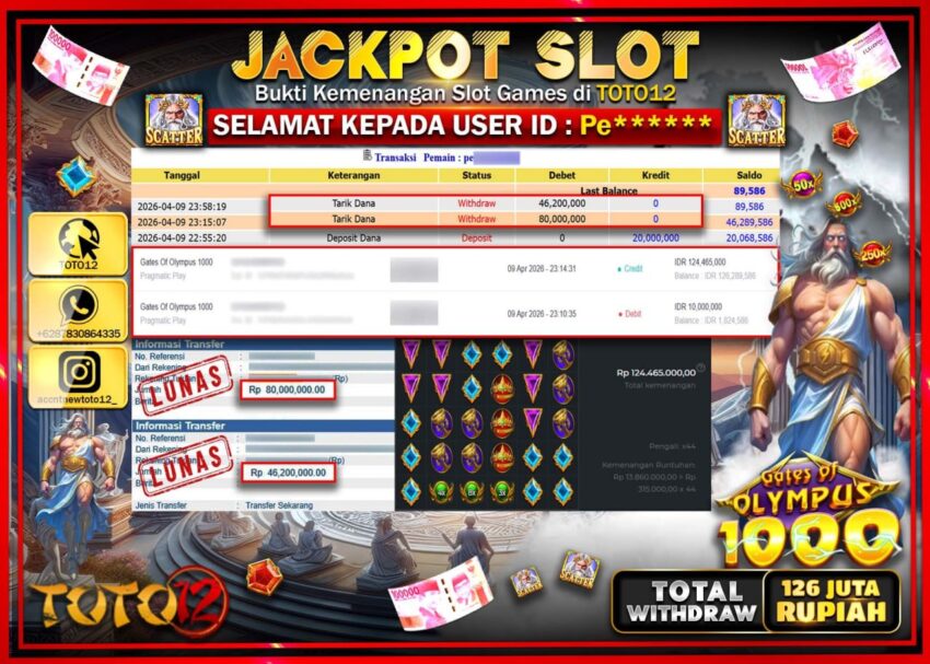 Selamat kepada Member Kami Pe***** Telah Jackpot dan berhasil mendapatkan kemenangan besar pada permainan JACKPOT SLOT GAME (GATES OF OLYMPUS 1000) Dengan Kemenangan Sebesar Rp.126.200.000–.
