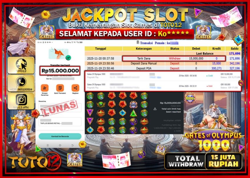 Selamat kepada Member Kami Ko****** Telah Jackpot dan berhasil mendapatkan kemenangan besar pada permainan JACKPOT SLOT GAME (GATES OF OLYMPUS 1000) Dengan Kemenangan Sebesar Rp.15.000.000 –. Setelah mengisi Fomulir Withdraw dengan Kurang waktu 1-2 Menit Dana sudah kami Trasnfer kepada Pemilik Userid dan dana sudah dapat di cairkan oleh pemenang. Bukti Pembayaran yang TOTO12 berikan merupakan Bukti Pembayaran yang SAH / VALID yang langsung Di dapatkan melalui transaksi dari Bank yang di Tunju.