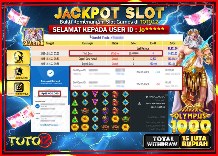 Selamat kepada Member Kami Jo****** Telah Jackpot dan berhasil mendapatkan kemenangan besar pada permainan JACKPOT SLOT GAME (GATES OF OLYMPUS 1000) Dengan Kemenangan Sebesar Rp.15.000.000 –.