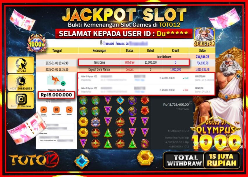Selamat kepada Member Kami Du****** Telah Jackpot dan berhasil mendapatkan kemenangan besar pada permainan JACKPOT SLOT GAME (GATES OF OLYMPUS 1000) Dengan Kemenangan Sebesar Rp.15.000.000 –.