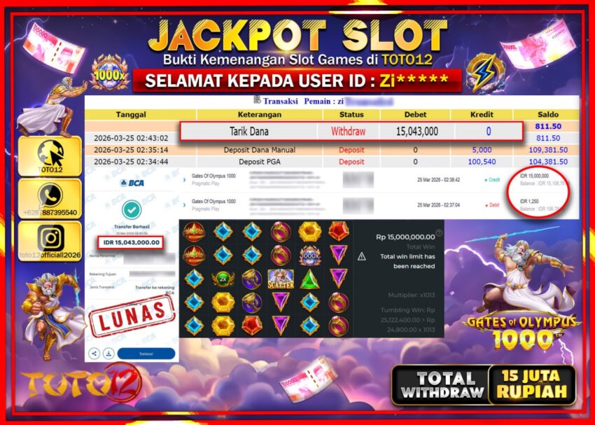 HANYA DI TOTO12 JP PASTI DI BAYAR LUNAS DAN CEPAT!!!!!! JACKPOT SLOT GAME (GATES OF OLYMPUS 1000) Rp.15.043.000!!!!