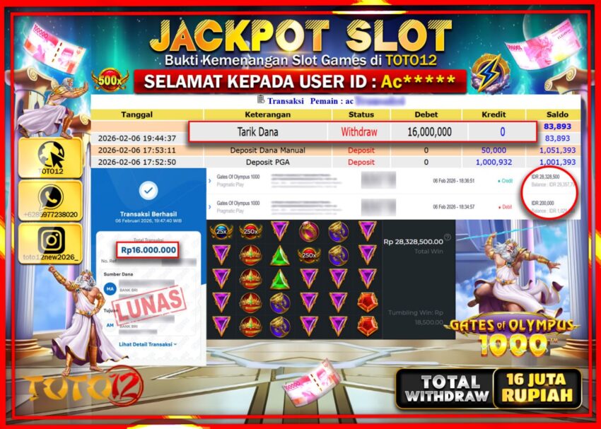Selamat kepada Member Kami Ac*****Telah Jackpot dan berhasil mendapatkan kemenangan besar pada permainan JACKPOT SLOT GAME (GATES OF OLYMPUS 1000 ) Dengan Kemenangan Sebesar Rp.16.000.000–.