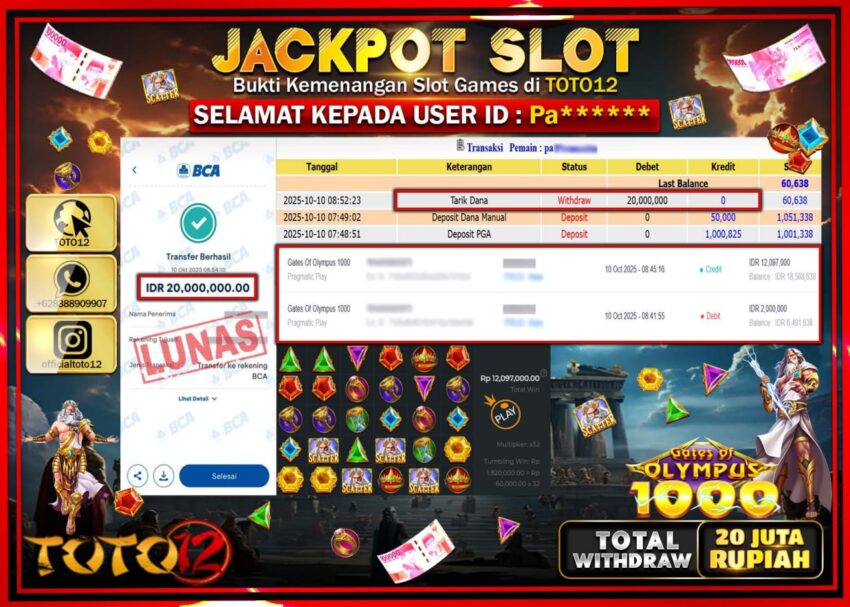 Selamat kepada Member Kami Pa****** Telah Jackpot dan berhasil mendapatkan kemenangan besar pada permainan JACKPOT SLOT GAME (GATES OF OLYMPUS 1000)  Dengan Kemenangan Sebesar Rp.20.000.000 –.  Setelah mengisi Fomulir Withdraw dengan Kurang waktu 1-2 Menit Dana sudah kami Trasnfer kepada Pemilik Userid dan dana sudah dapat di cairkan oleh pemenang. Bukti Pembayaran yang TOTO12 berikan merupakan Bukti Pembayaran yang  SAH / VALID yang langsung Di dapatkan melalui transaksi dari Bank yang di Tunju.
