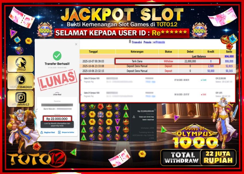 Selamat kepada Member Kami Re****** Telah Jackpot dan berhasil mendapatkan kemenangan besar pada permainan JACKPOT SLOT GAME (GATES OF OLYMPUS 1000) Dengan Kemenangan Sebesar Rp.22.000.000 –. Setelah mengisi Fomulir Withdraw dengan Kurang waktu 1-2 Menit Dana sudah kami Trasnfer kepada Pemilik Userid dan dana sudah dapat di cairkan oleh pemenang. Bukti Pembayaran yang TOTO12 berikan merupakan Bukti Pembayaran yang SAH / VALID yang langsung Di dapatkan melalui transaksi dari Bank yang di Tunju.