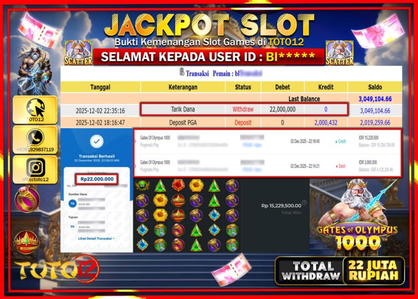 Selamat kepada Member Kami Bl****** Telah Jackpot dan berhasil mendapatkan kemenangan besar pada permainan JACKPOT SLOT GAME (GATES OF OLYMPUS 1000) Dengan Kemenangan Sebesar Rp.22.000.000 –.