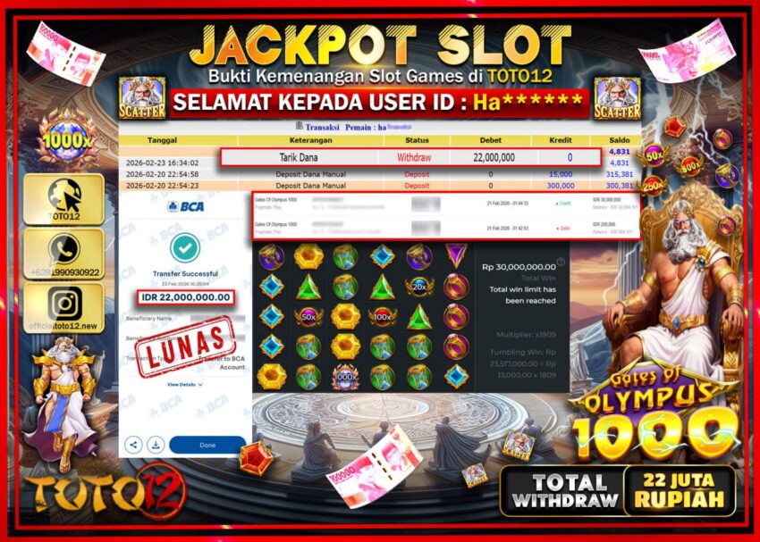 HANYA DI TOTO12 JP PASTI DI BAYAR LUNAS DAN CEPAT!!!!!! JACKPOT SLOT GAME (GATES OF OLYMPUS 1000) Rp.22.000.000!!!!