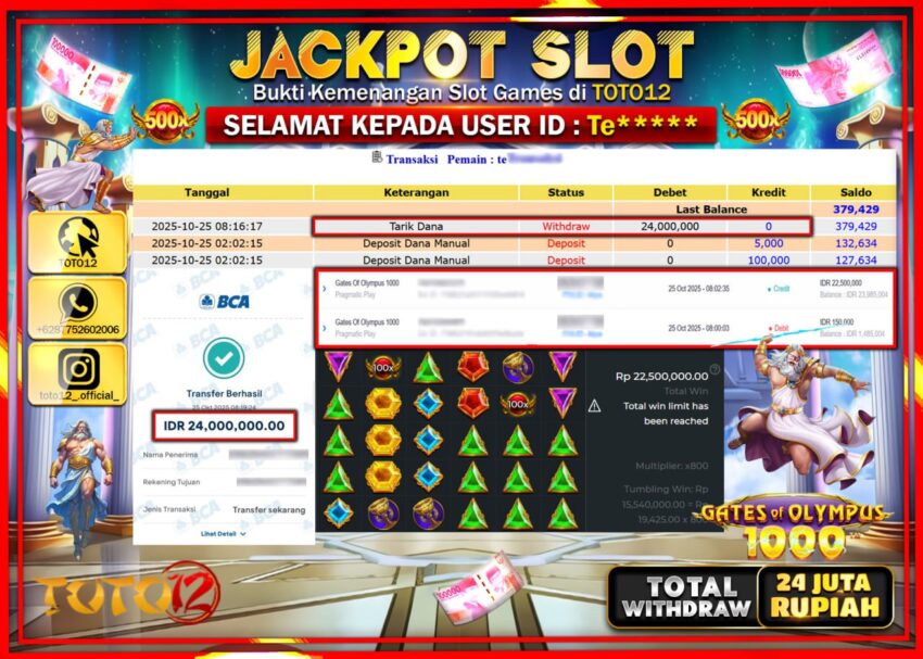 Selamat kepada Member Kami Te****** Telah Jackpot dan berhasil mendapatkan kemenangan besar pada permainan JACKPOT SLOT GAME (GATES OF OLYMPUS 1000) Dengan Kemenangan Sebesar Rp.24.000.000 –. Setelah mengisi Fomulir Withdraw dengan Kurang waktu 1-2 Menit Dana sudah kami Trasnfer kepada Pemilik Userid dan dana sudah dapat di cairkan oleh pemenang. Bukti Pembayaran yang TOTO12 berikan merupakan Bukti Pembayaran yang SAH / VALID yang langsung Di dapatkan melalui transaksi dari Bank yang di Tunju.