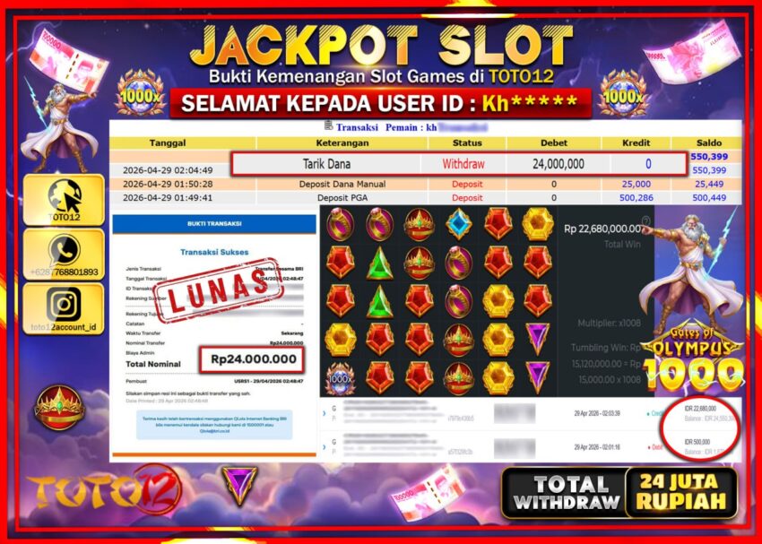 Selamat kepada Member Kami Kh***** Telah Jackpot dan berhasil mendapatkan kemenangan besar pada permainan JACKPOT SLOT GAME  (GATES OF OLYMPUS 1000)  Dengan Kemenangan Sebesar Rp.24.000.000–.