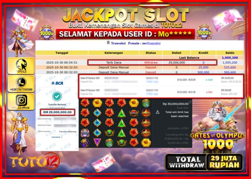 Selamat kepada Member Kami Mo****** Telah Jackpot dan berhasil mendapatkan kemenangan besar pada permainan JACKPOT SLOT GAME (GATES OF OLYMPUS 1000) Dengan Kemenangan Sebesar Rp.29.000.000 –. Setelah mengisi Fomulir Withdraw dengan Kurang waktu 1-2 Menit Dana sudah kami Trasnfer kepada Pemilik Userid dan dana sudah dapat di cairkan oleh pemenang. Bukti Pembayaran yang TOTO12 berikan merupakan Bukti Pembayaran yang SAH / VALID yang langsung Di dapatkan melalui transaksi dari Bank yang di Tunju.