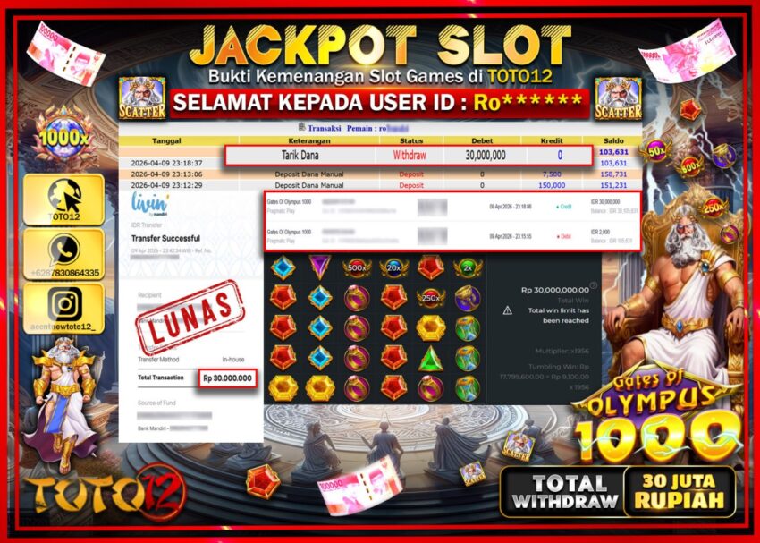 Selamat kepada Member Kami Ro***** Telah Jackpot dan berhasil mendapatkan kemenangan besar pada permainan JACKPOT SLOT GAME (GATES OF OLYMPUS 1000) Dengan Kemenangan Sebesar Rp.30.000.000–.