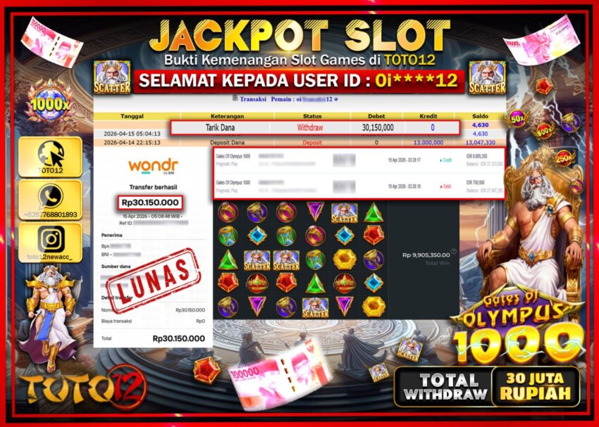 Selamat kepada Member Kami Oi*****12 Telah Jackpot dan berhasil mendapatkan kemenangan besar pada permainan JACKPOT SLOT GAME  (GATES OF OLYMPUS 1000)  Dengan Kemenangan Sebesar Rp.30.150.000–.