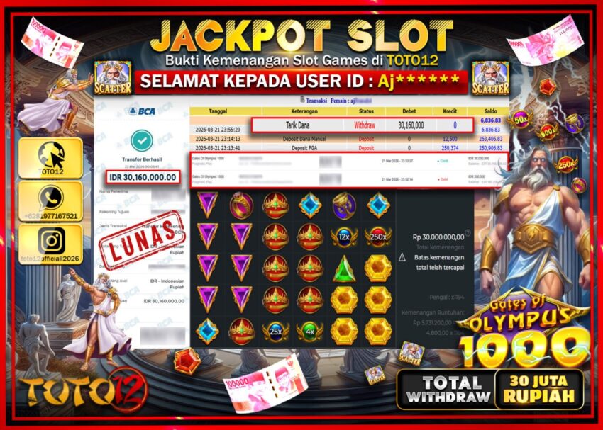 Selamat kepada Member Kami Aj**** Telah Jackpot dan berhasil mendapatkan kemenangan besar pada permainan JACKPOT SLOT GAME (GATES OF OLYMPUS 1000) Dengan Kemenangan Sebesar Rp.30.160.000–.