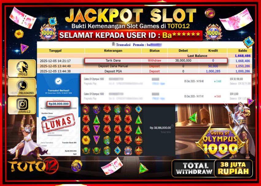 Selamat kepada Member Kami Ba****** Telah Jackpot dan berhasil mendapatkan kemenangan besar pada permainan JACKPOT SLOT GAME (GATES OF OLYMPUS 1000) Dengan Kemenangan Sebesar Rp.38.000.000 –.