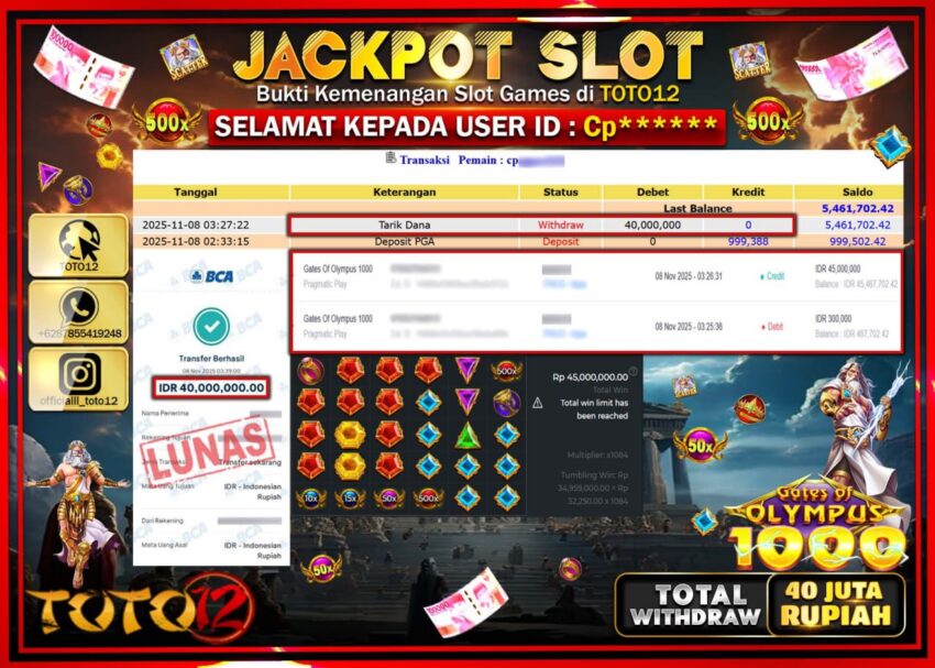 Selamat kepada Member Kami Cp****** Telah Jackpot dan berhasil mendapatkan kemenangan besar pada permainan JACKPOT SLOT GAME (GATES OF OLYMPUS 1000) Dengan Kemenangan Sebesar Rp.40.000.000 –. Setelah mengisi Fomulir Withdraw dengan Kurang waktu 1-2 Menit Dana sudah kami Trasnfer kepada Pemilik Userid dan dana sudah dapat di cairkan oleh pemenang. Bukti Pembayaran yang TOTO12 berikan merupakan Bukti Pembayaran yang SAH / VALID yang langsung Di dapatkan melalui transaksi dari Bank yang di Tunju.