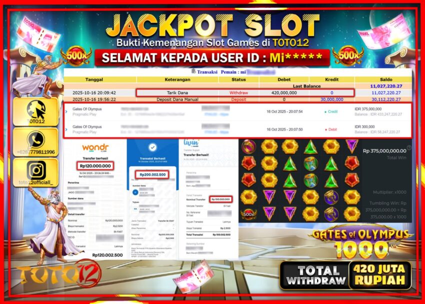 Selamat kepada Member Kami Mi****** Telah Jackpot dan berhasil mendapatkan kemenangan besar pada permainan JACKPOT SLOT GAME (GATES OF OLYMPUS 1000) Dengan Kemenangan Sebesar Rp.450.000.000 –. Setelah mengisi Fomulir Withdraw dengan Kurang waktu 1-2 Menit Dana sudah kami Trasnfer kepada Pemilik Userid dan dana sudah dapat di cairkan oleh pemenang. Bukti Pembayaran yang TOTO12 berikan merupakan Bukti Pembayaran yang SAH / VALID yang langsung Di dapatkan melalui transaksi dari Bank yang di Tunju.