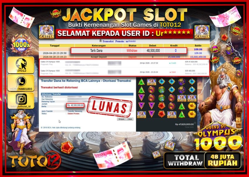 Selamat kepada Member Kami Ur***** Telah Jackpot dan berhasil mendapatkan kemenangan besar pada permainan JACKPOT SLOT GAME (GATES OF OLYMPUS 1000) Dengan Kemenangan Sebesar Rp.48.500.000–.