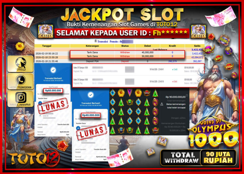 Selamat kepada Member Kami Fh****** Telah Jackpot dan berhasil mendapatkan kemenangan besar pada permainan JACKPOT SLOT GAME (GATES OF OLYMPUS 1000) Dengan Kemenangan Sebesar Rp.90.000.000–.