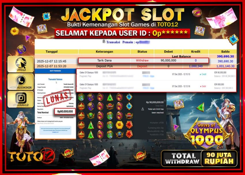 Selamat kepada Member Kami Op****** Telah Jackpot dan berhasil mendapatkan kemenangan besar pada permainan JACKPOT SLOT GAME (GATES OF OLYMPUS 1000) Dengan Kemenangan Sebesar Rp.90.000.000 –.