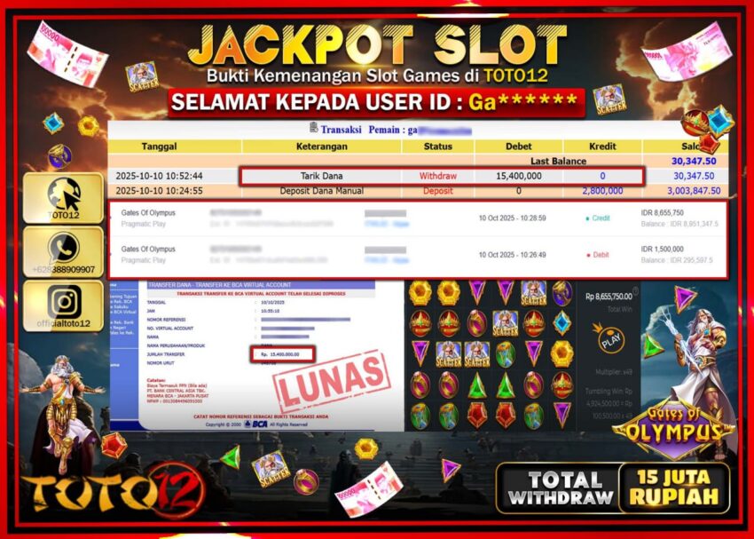 Selamat kepada Member Kami Ga****** Telah Jackpot dan berhasil mendapatkan kemenangan besar pada permainan JACKPOT SLOT GAME (GATES OF OLYMPUS)  Dengan Kemenangan Sebesar Rp.15.400.000 –.  Setelah mengisi Fomulir Withdraw dengan Kurang waktu 1-2 Menit Dana sudah kami Trasnfer kepada Pemilik Userid dan dana sudah dapat di cairkan oleh pemenang. Bukti Pembayaran yang TOTO12 berikan merupakan Bukti Pembayaran yang  SAH / VALID yang langsung Di dapatkan melalui transaksi dari Bank yang di Tunju.