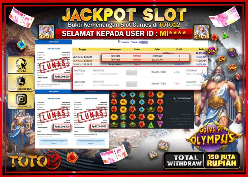 HANYA DI TOTO12 JP PASTI DI BAYAR LUNAS DAN CEPAT!!!!!! JACKPOT SLOT GAME (GATES OF OLYMPUS) Rp.150.000.000!!!!