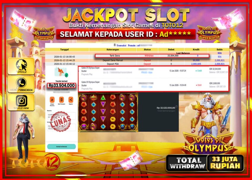 Selamat kepada Member Kami Ad****** Telah Jackpot dan berhasil mendapatkan kemenangan besar pada permainan JACKPOT SLOT GAME (GATES OF OLYMPUS) Dengan Kemenangan Sebesar Rp.33.504.000 –.