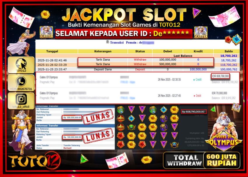 HANYA DI TOTO12 JP PASTI DI BAYAR LUNAS DAN CEPAT!!!!!! JACKPOT SLOT GAME (GATES OF OLYMPUS) Rp.600.000.000 !!!!