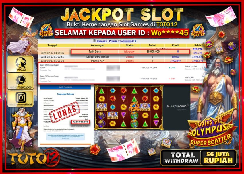HANYA DI TOTO12 JP PASTI DI BAYAR LUNAS DAN CEPAT!!!!!! JACKPOT SLOT GAME (GATES OF OLYMPUS SUPER SCATERSS) Rp.56.000.000!!!!
