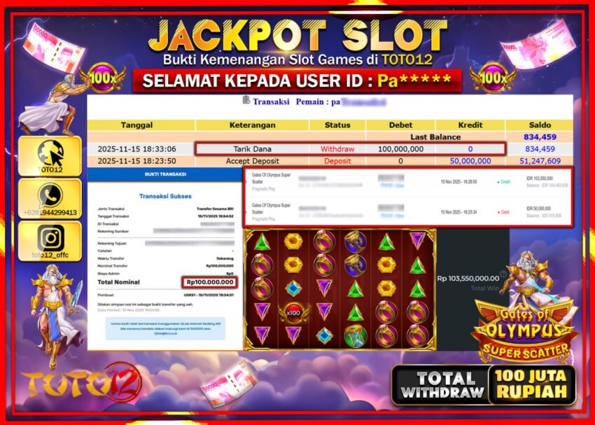 Selamat kepada Member Kami Pa****** Telah Jackpot dan berhasil mendapatkan kemenangan besar pada permainan JACKPOT SLOT GAME (GATES OF OLYMPUS SUPER SCATTER) Dengan Kemenangan Sebesar Rp.100.000.000 –. Setelah mengisi Fomulir Withdraw dengan Kurang waktu 1-2 Menit Dana sudah kami Trasnfer kepada Pemilik Userid dan dana sudah dapat di cairkan oleh pemenang. Bukti Pembayaran yang TOTO12 berikan merupakan Bukti Pembayaran yang SAH / VALID yang langsung Di dapatkan melalui transaksi dari Bank yang di Tunju.