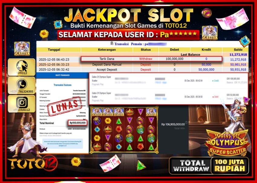 Selamat kepada Member Kami Pa****** Telah Jackpot dan berhasil mendapatkan kemenangan besar pada permainan JACKPOT SLOT GAME (GATES OF OLYMPUS SUPER SCATTER) Dengan Kemenangan Sebesar Rp.100.000.000 –.