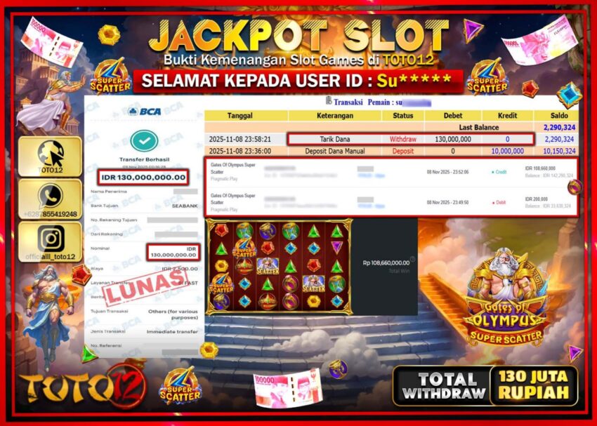 Selamat kepada Member Kami Su****** Telah Jackpot dan berhasil mendapatkan kemenangan besar pada permainan JACKPOT SLOT GAME (GATES OF OLYMPUS SUPER SCATTER) Dengan Kemenangan Sebesar Rp.130.000.000 –. Setelah mengisi Fomulir Withdraw dengan Kurang waktu 1-2 Menit Dana sudah kami Trasnfer kepada Pemilik Userid dan dana sudah dapat di cairkan oleh pemenang. Bukti Pembayaran yang TOTO12 berikan merupakan Bukti Pembayaran yang SAH / VALID yang langsung Di dapatkan melalui transaksi dari Bank yang di Tunju.