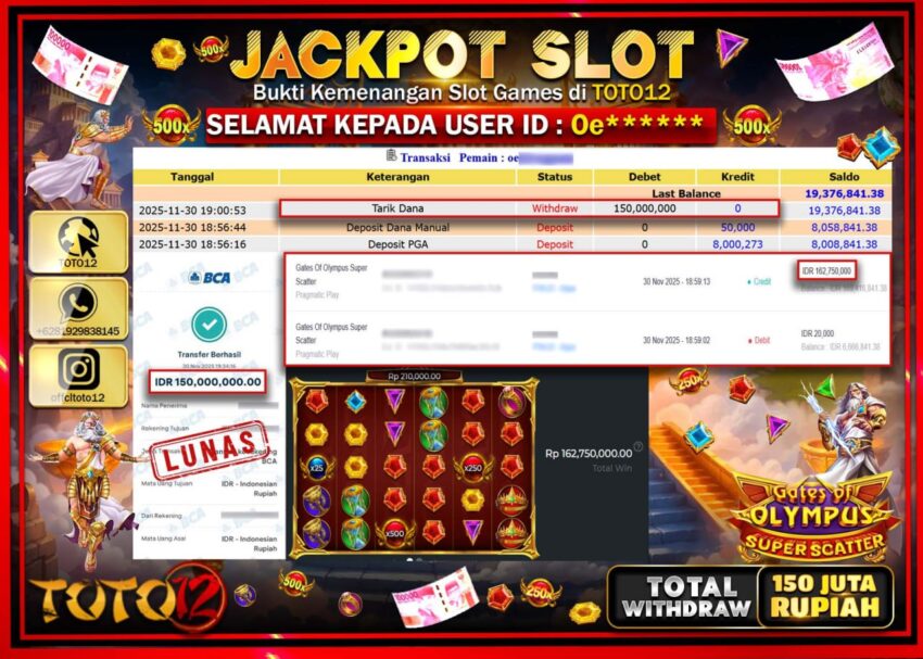 HANYA DI TOTO12 JP PASTI DI BAYAR LUNAS DAN CEPAT!!!!!! JACKPOT SLOT GAME (GATES OF OLYMPUS SUPER SCATTER) Rp.150.000.000 !!!!