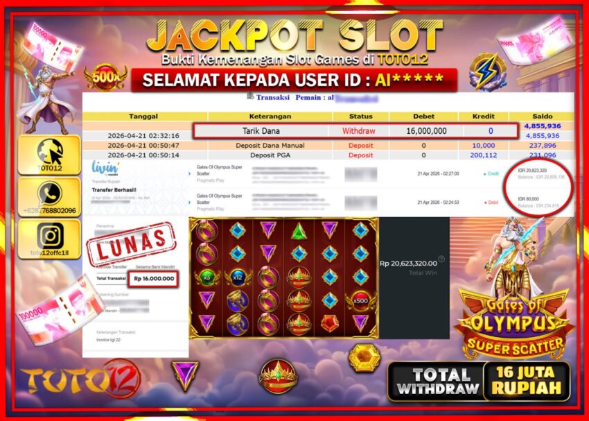 Selamat kepada Member Kami AI***** Telah Jackpot dan berhasil mendapatkan kemenangan besar pada permainan JACKPOT SLOT GAME (GATES OF OLYMPUS SUPER SCATTER) Dengan Kemenangan Sebesar Rp.16.000.000–.