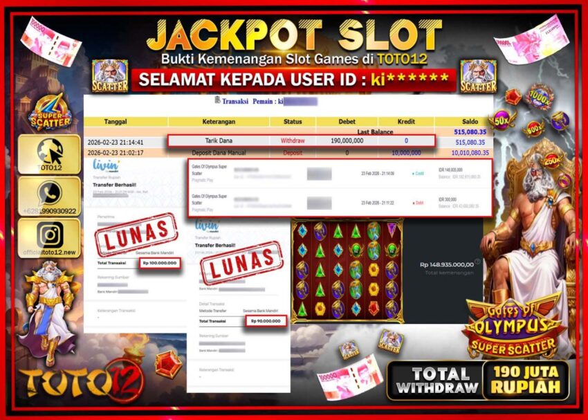 Selamat kepada Member Kami Ki***** Telah Jackpot dan berhasil mendapatkan kemenangan besar pada permainan JACKPOT SLOT GAME (GATES OF OLYMPUS SUPER SCATTER) Dengan Kemenangan Sebesar Rp.190.000.000–.