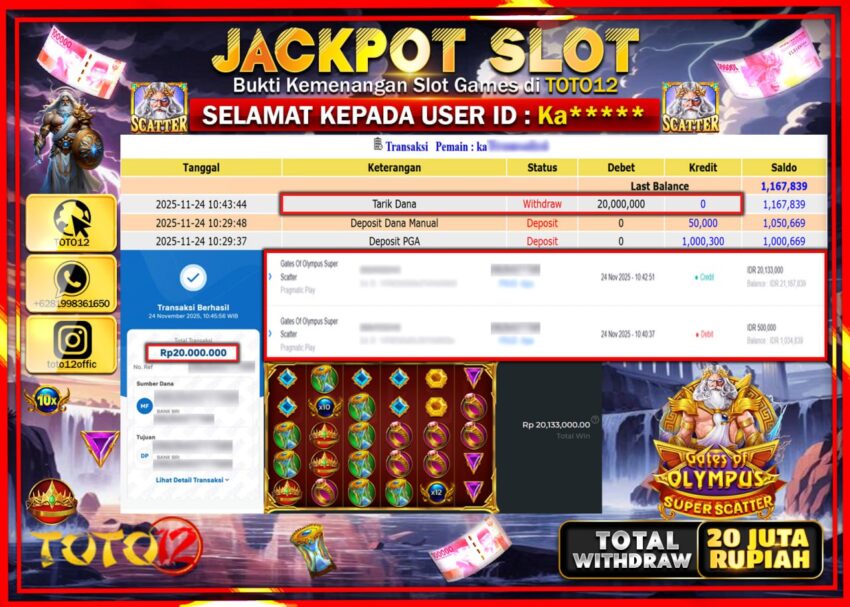 Selamat kepada Member Kami Ka****** Telah Jackpot dan berhasil mendapatkan kemenangan besar pada permainan JACKPOT SLOT GAME (GATES OF OLYMPUS SUPER SCATTER) Dengan Kemenangan Sebesar Rp.20.000.000 –. Setelah mengisi Fomulir Withdraw dengan Kurang waktu 1-2 Menit Dana sudah kami Trasnfer kepada Pemilik Userid dan dana sudah dapat di cairkan oleh pemenang. Bukti Pembayaran yang TOTO12 berikan merupakan Bukti Pembayaran yang SAH / VALID yang langsung Di dapatkan melalui transaksi dari Bank yang di Tunju.